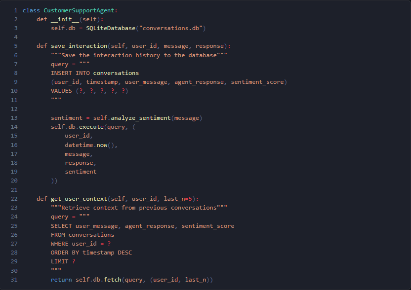 例2:Customer Support Agent 過去の会話履歴を SQLite に保存し、ユーザーごとの文脈を呼び出す。