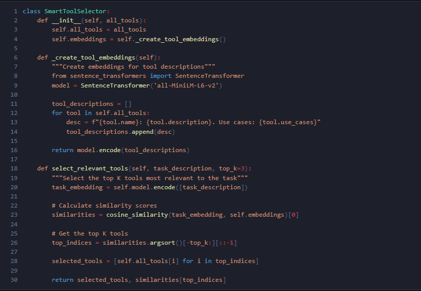 例:SmartToolSelector タスク記述に基づき、最も関連度の高いツールを自動選択。